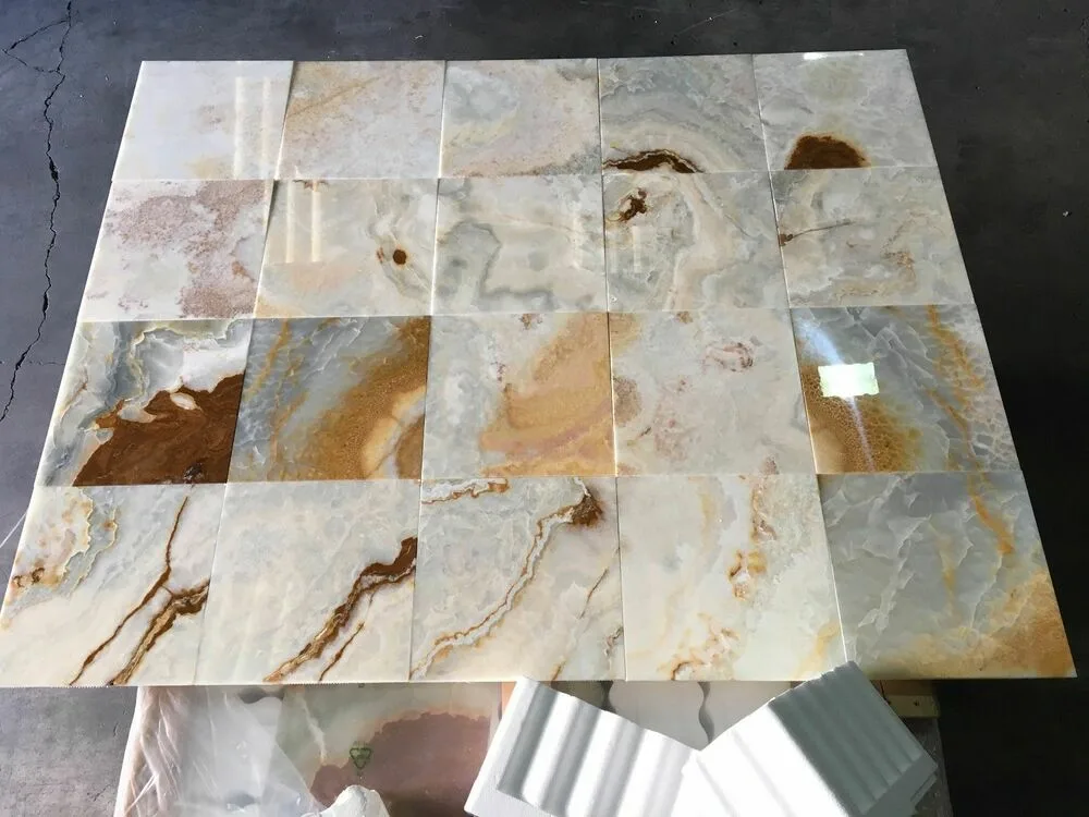 Оникс -- один из самых интересных камней. Каждое изделие имеет уникальный рисунок. Его полупрозрачная структура идеально подчеркивает камень и его теплый цвет. Камень применяется при работе с напольными покрытиями, используется для мозаичных плиток, а также для внутренних стен, душевой зоны и ванных комнат.
